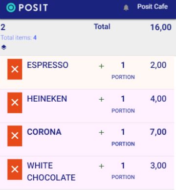 Below is the list of ordered items. Tap the "X" next to the items you want to remove. You can change the quantity and price of the product by tapping on the number and modifying it. If you want to change the parameters of a product, select the product, and the parameterization screen will appear. If you want to add more products, press the "+" button to go to the Pricelist. The same can be achieved by swiping the screen to the right.